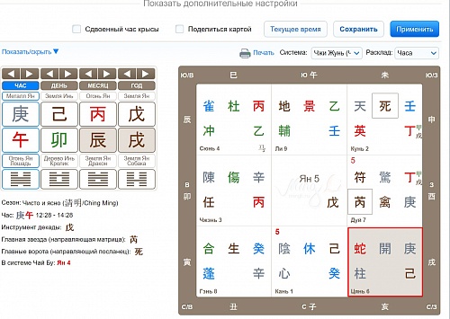 Прошу посмотреть карту ци мень которую я составила на момент возникновения вопроса, поступит ли моя младшая сестра в этом году медицинский колледж? она 1994(Цзя Сюй) года рождения, заметила что её столп дня полностью дублирует столп этого дня, она тоже И Хай)